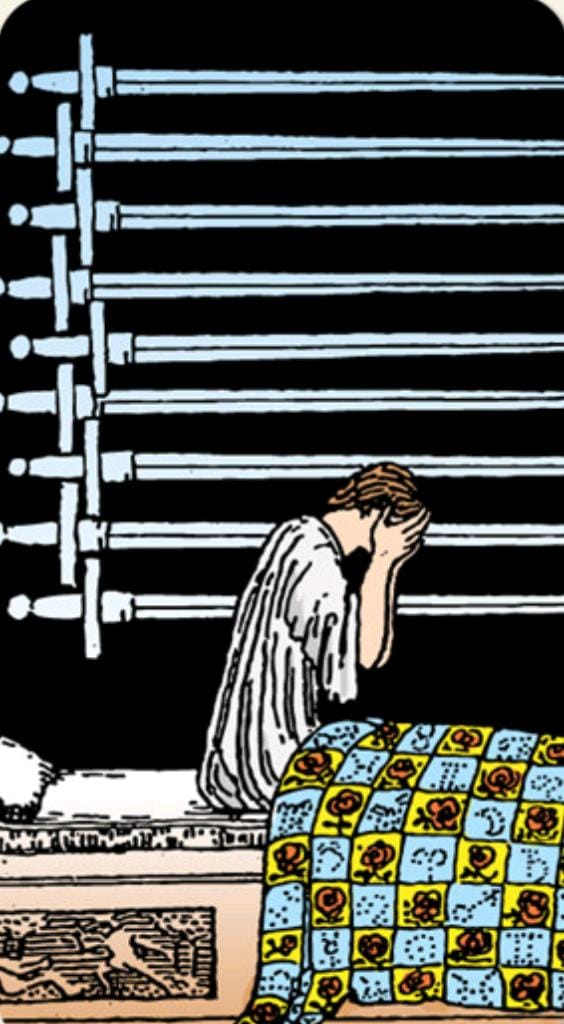 El Nueve de Espadas nos muestra a una figura sentada en su cama, con la cabeza entre las manos, atormentada por nueve espadas colgando sobre ella. Es la carta de la preocupación, la ansiedad, las pesadillas y el tormento mental. A menudo aparece cuando la tristeza es abrumadora y no nos deja dormir, o cuando nos sentimos atrapados en un ciclo de pensamientos negativos.